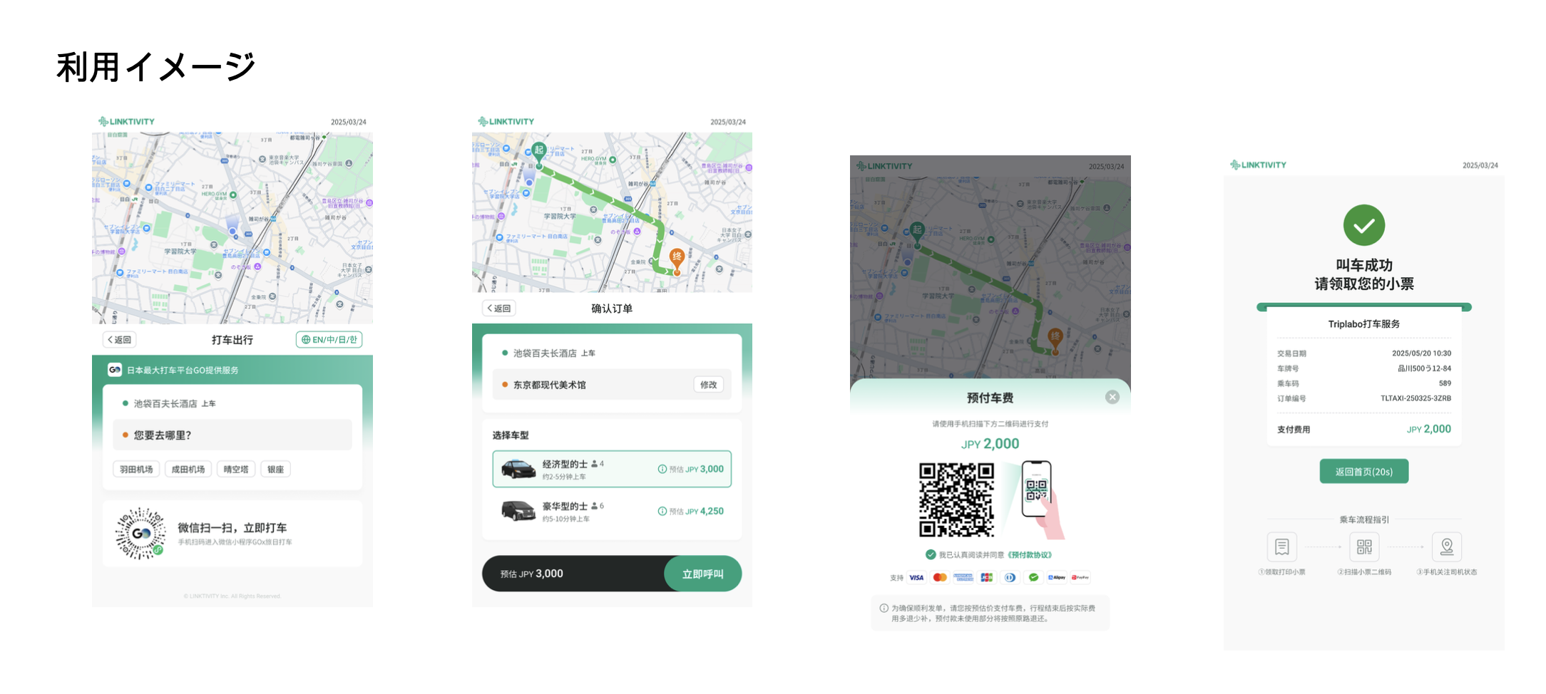 宿泊者は、中国語(簡体字・繁体字)・英語・韓国語・日本語に対応したTriplaboKioskの画面を操作するだけで、簡単にタクシーを呼ぶことができます。リアルタイムで車両の位置を確認できるほか、クレジットカードや主要なQRコード決済にも対応しており、「言語の壁なし、支払いの手間なし、直感的な使い心地」によるスマートな移動体験を提供します。